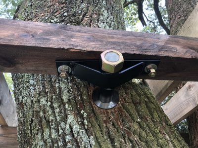 以前は、木を木材で挟んでツリーハウスを支える工法(サンドイッチ工法)が主流でしたが、これでは木を締め付ける事になるので、負担が大きいんです。