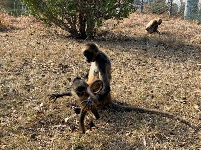 母はジャングルジム Posted on 2018年12月27日 by keeper モンキースカイウェイ担当:山田 最近、ジェフロイクモザルの子供であるレイリーが大きくなって、母親から離れて動くようになりました。 動きがかなりアグレッシブになり、母親のレイコが大変そうです。 すぐにレイコから離れて、地面にダイブしています(笑) 心配になっちゃいそうです。 しまいには・・・ 母親レイコの首に尻尾を巻き付けてぶらぶら・・・ レイコがジャングルジム化しています(笑) レイコかなり迷惑そうです。 そして、最後にこのどや顔・・・ 憎らしけど、でもかわいいから許してしましますね!