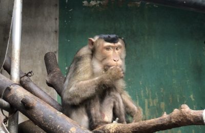さて、ミナミブタオザルの特徴として、『たまに変な顔をしちゃう』ってものがあります。これは、アジア館では、”シシオザル”と本種の2種類だけで見ることができます。