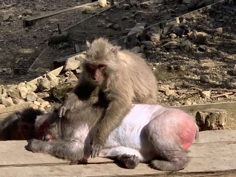 一方でヤクシマザルの暮らすモンキーバレイには、上述したようなお見合いをさせるスペースは無いし(一応あるけど、気温が暖かくならないと使えない)、加えて個体数が約140頭と多く、攻撃する個体だけを外すなんて現実的では無いので、昼ごはんの最中にしれっと群れに戻す