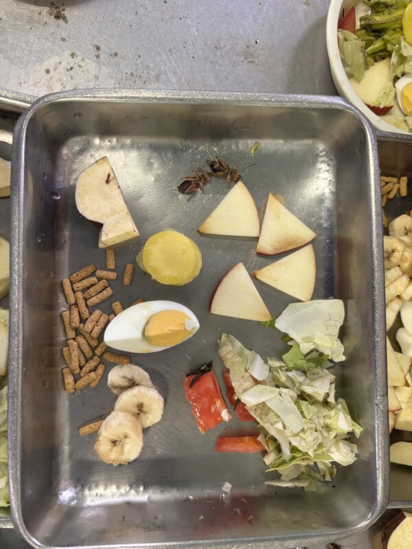 ZAS(動物用ペレット)、SPS(動物用ペレット)、アラビアガム、サツマイモ、蒸し芋、ニンジン、リンゴ、バナナ、パイン芯、ゆで卵、コオロギ、葉野菜、その他(果物や野菜)を与えている。それぞれの値段は収穫時期や燃料費によって変わってくるため今の大雑把な価格でしか伝えることができないので容赦願いたい。