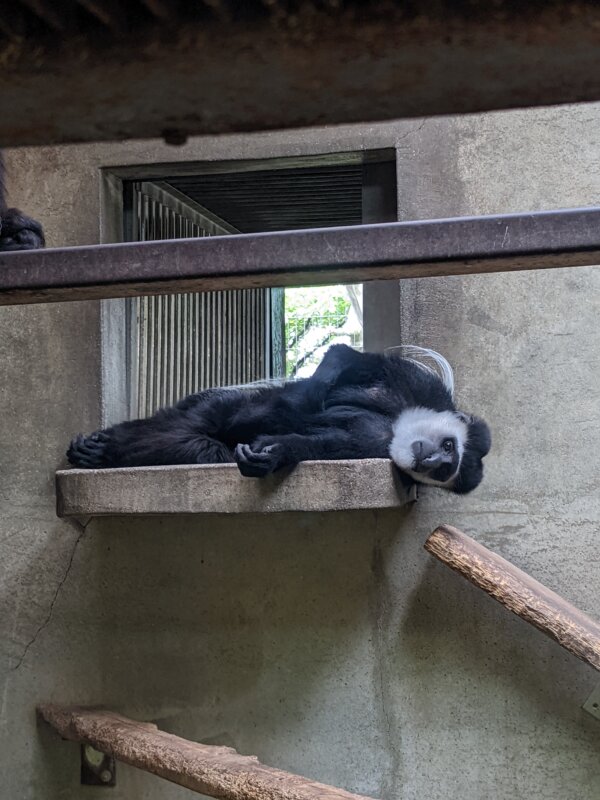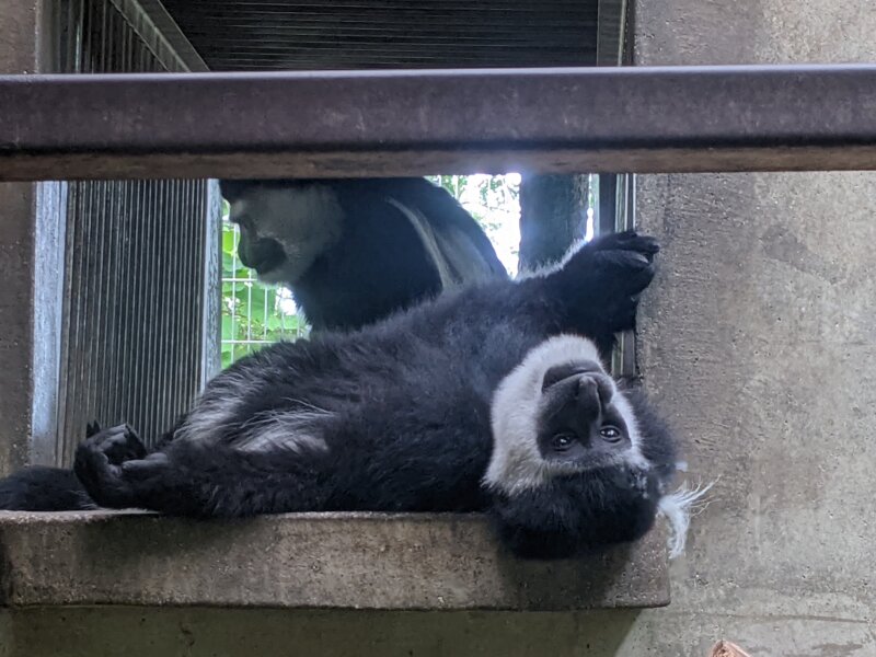 現在は原野と森の家で賑やかな空気で過ごしているアビシニアコロブスですが、イロハは同居しているレナと2頭で過ごしているときは独特な姿勢で休んでいることもありました。
