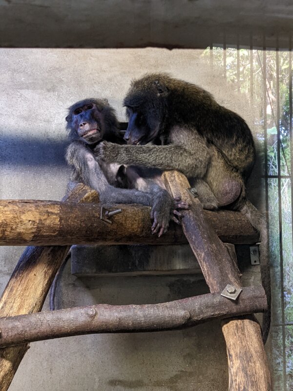 同じく原野と森の家にいるアヌビスヒヒたちは当時はナイツ、ナポロ、ヘイタの3頭で過ごしていました。その時の群れの関係性は、ヘイタはナポロに対してあまり気にとめていませんでしたが、ナポロはヘイタが苦手で、写真の左ナポロに右ヘイタが毛づくろいしてくれていますが、ナポロはプレッシャーを感じている姿も当時はありました。