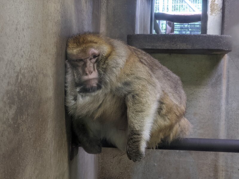 数年前のアフリカ館には今アフリカセンターにいる多くのバーバリーマカクを飼育しており、その時は写真のサムソンはメスの中で一番強い個体だったのですが、現在は周りのメス達が自信を持ちサムソンの順位がかなり下がっているようです。当時はまだ圧のある姿が見られました。