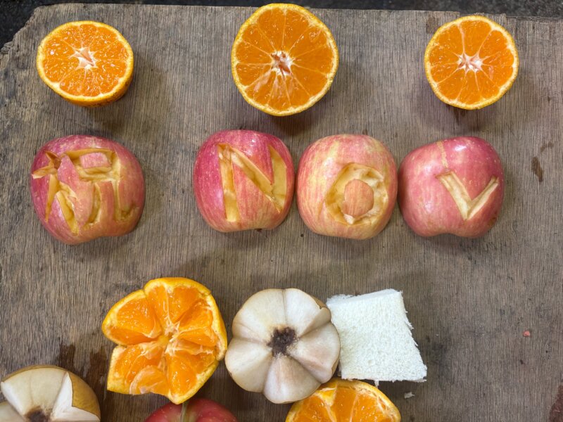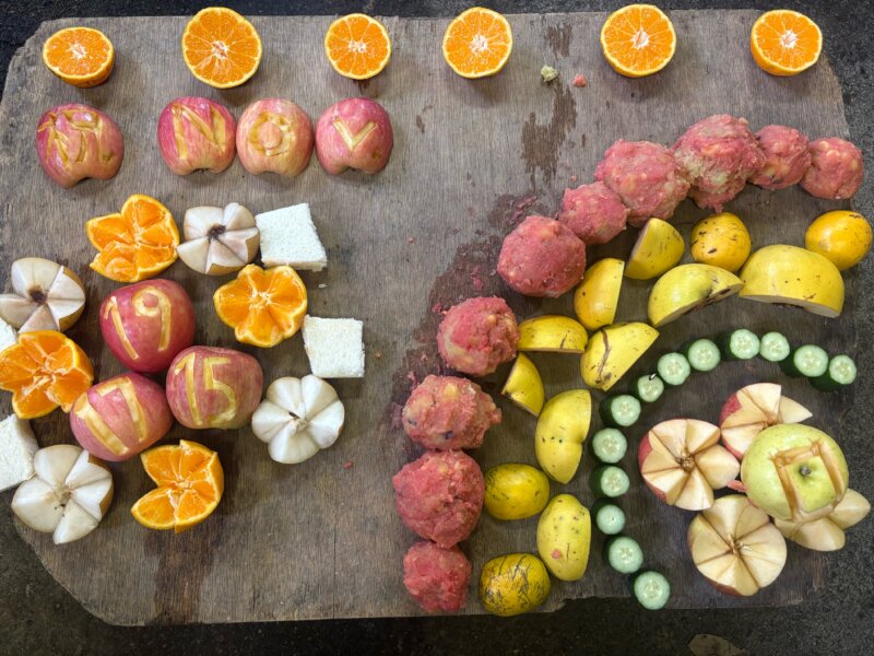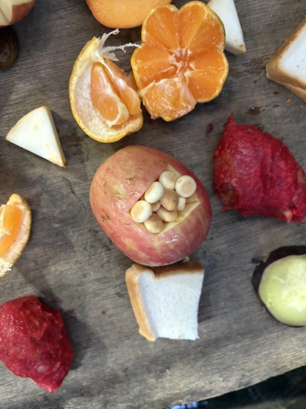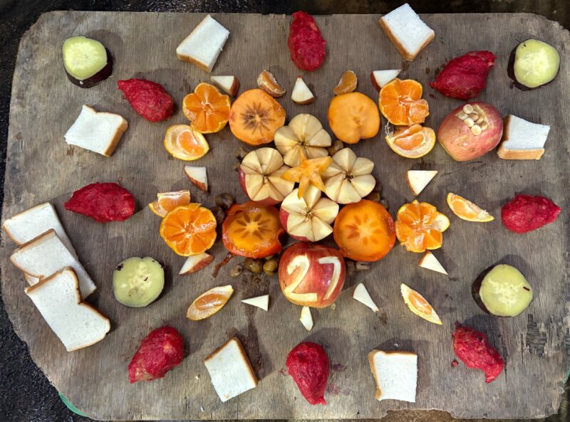 こちらのプレートでは、リンゴ、ミカン、ナシ、パン、ムシイモ、カリン、キュウリを使っています。テーマは「虹」です!