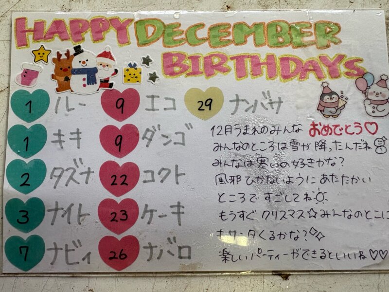 12月は誕生日を迎える個体が最も多い月なので、今月は4回に分けて開催しました。
