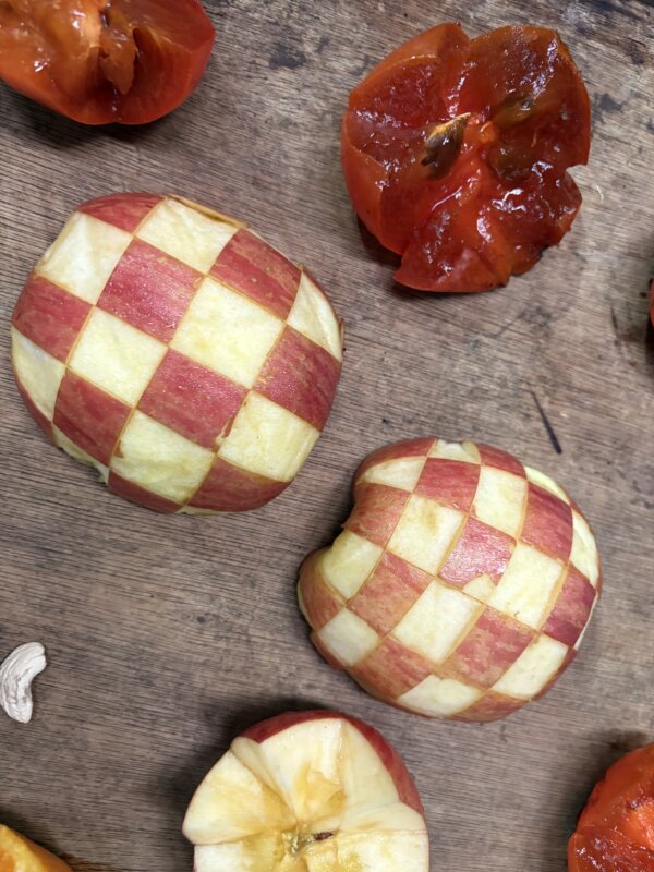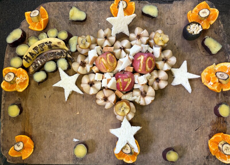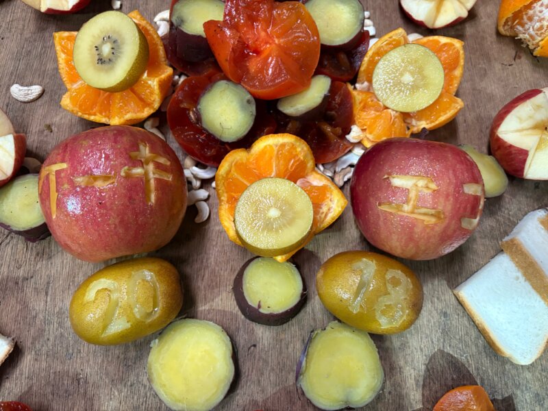 こちら!珍しく名前をリンゴで彫ってみました。年齢は下にキウイで入れてます。
