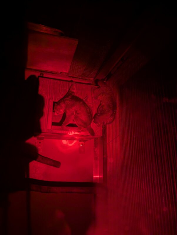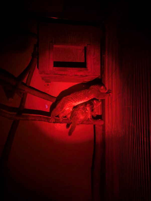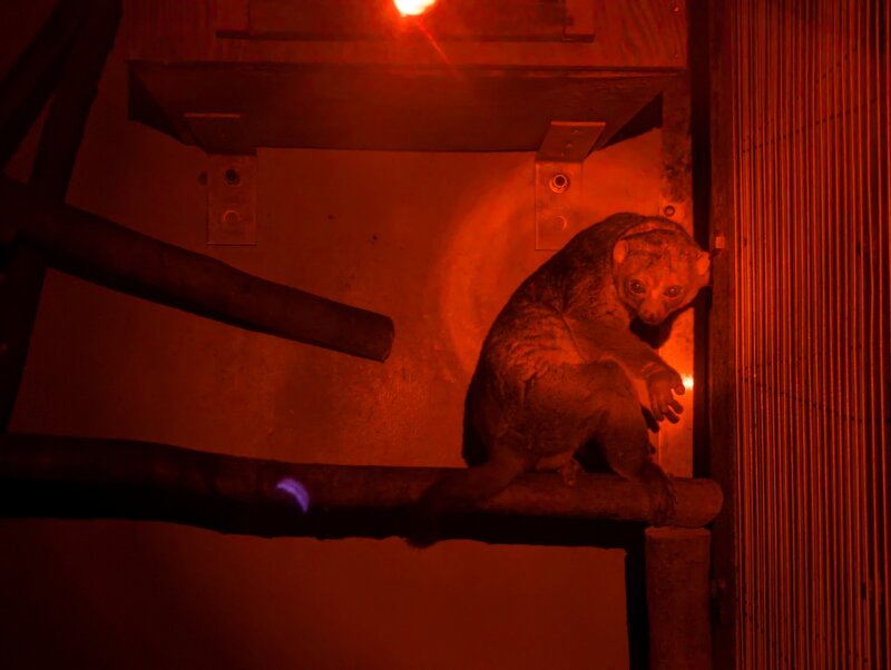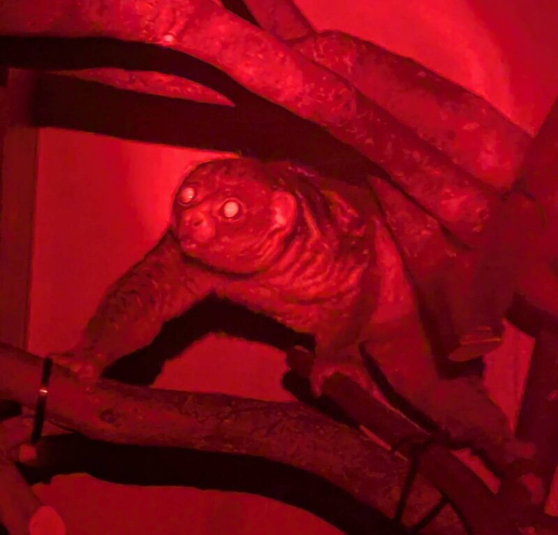 夜行性動物の動きを観察できるように9:00-21:00は部屋を暗くして夜行性動物の目にほとんど感知できない赤いライトで照らしていますが、21:00-9:00は部屋が明るくて彼らは寝ています。通常の毛色は茶色です。