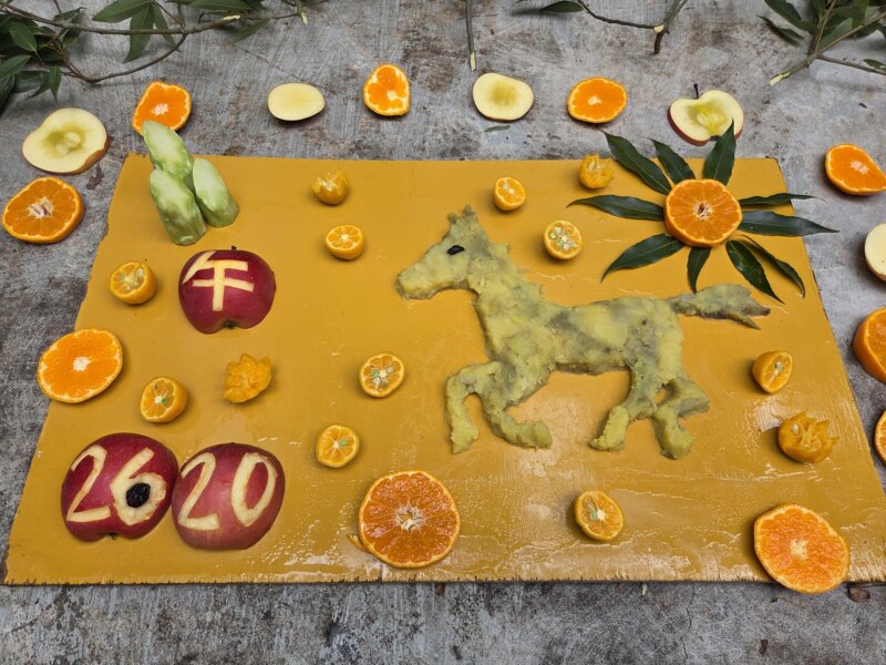 馬はムシイモ、左上の門松はブロッコリーの芯です。