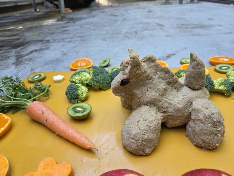 アヌビスヒヒのお顔に切ったリンゴと立体的になった馬(サル用ペレットを水でダンゴ状にしてムシイモを混ぜたもの)です。