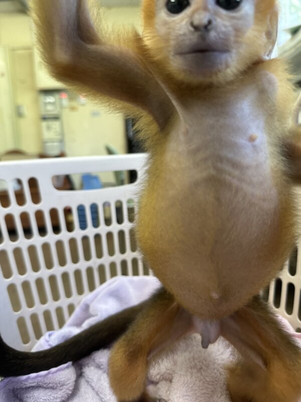 腹腔のガスを抜く大きな処置をした後のヨウです。処置の邪魔になるのでオレンジの毛は少し刈られてお腹が見えています。