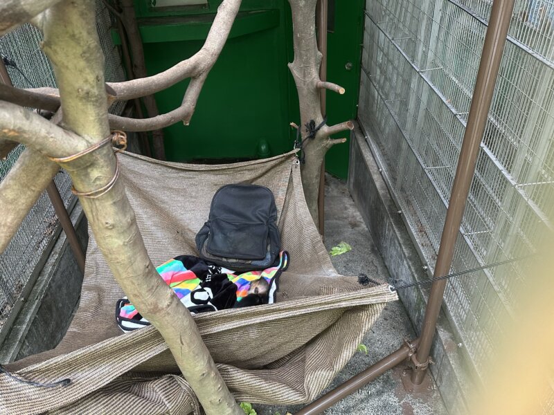 ↓疲れるとハンモックの上でお昼寝。(安心できる毛布とリュックを近くに置いて)