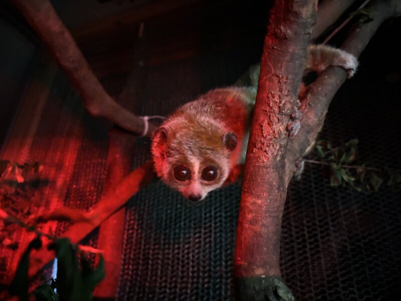 スローロリスは夜行性の小型霊長類であり夜行性である。上記にあるように東南アジアを中心に9種類いるとされている。まだ解明されていないことも多いが野生では樹液や昆虫を主食にしているそうだ。18世紀にはゆっくりとした動きであることからナマケモノのなかまだと考えられていた。のちに様々な研究によって霊長類であることが分かった。「ロリス」という名前はオランダ語で「道化」という意味なのだそうだ。霊長類の中で唯一毒をもっていることも特徴である。