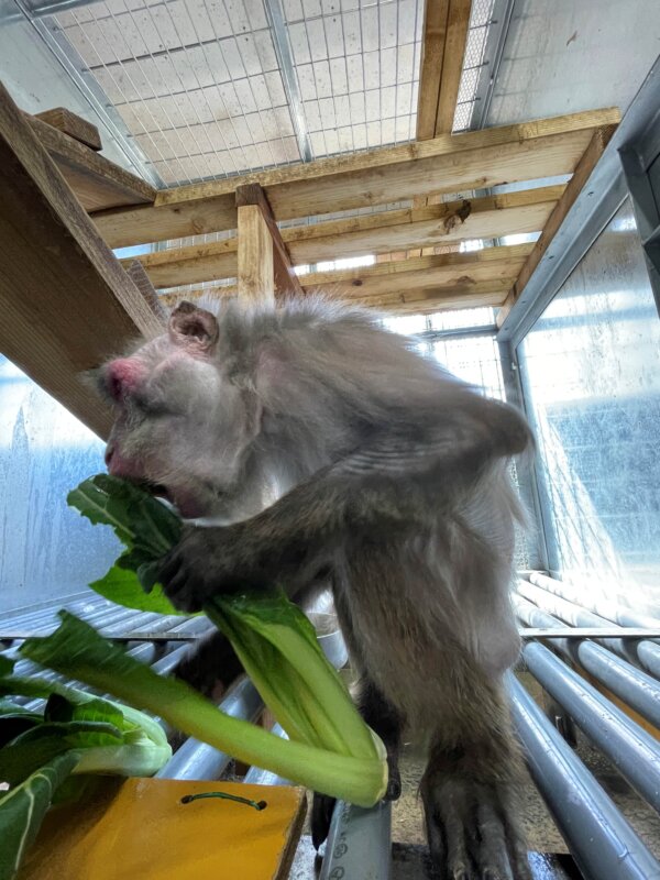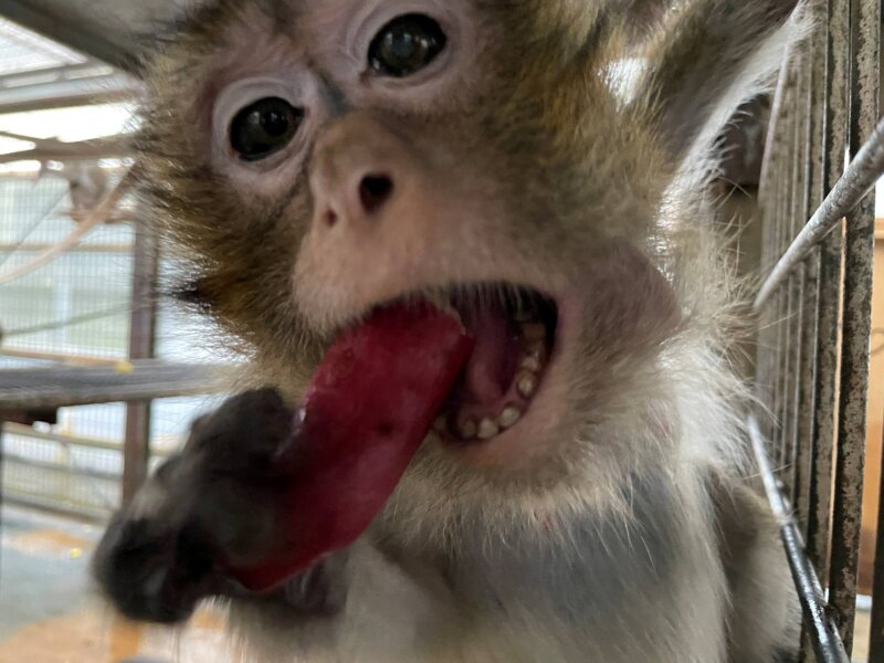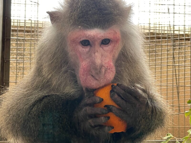 最後に、カニクイザルのタカコにもご寄附をいただきました!飼育員による個体識別率No.1(たぶん)のタカコさん。群れの中で一番順位が低いので、普段おイモは小さく切られたものを急いで頬袋に詰めているのですが、この日は特別に大きな塊☆群れ全体のトレーニングにより、弱いタカコもこの場所では、強い個体に取られることなく食べきることができました!