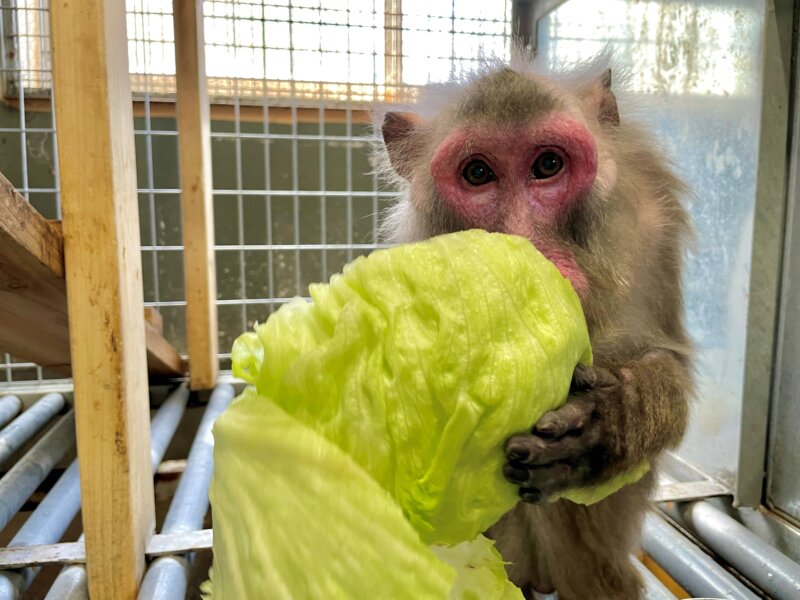 それからヤクシマザルのヒゲッコにも葉野菜などをいただきました!顔よりも大きいレタスをガブリ!