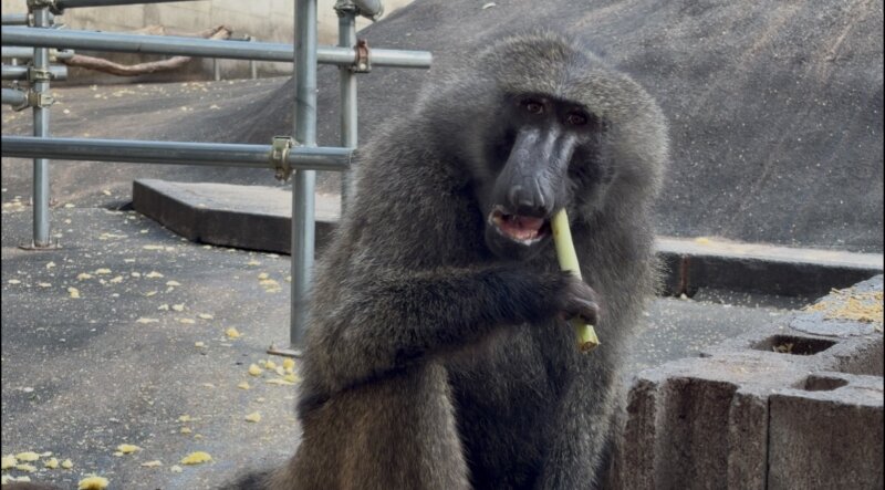 【バブーン補給】サトウキビどうでしょう Posted on 2025年12月15日 by keeper ヒヒの城:川原 皆さまこんにちは!肌寒い季節になりましたがみなさまはいかがお過ごしでしょうか? 今日はご寄付でいただきましたサトウキビをアヌビスヒヒたちにプレゼントしました♪ ↑タズナです。顎が鍛えられそう。。ずーっとカミカミしています。 豪快に割っているナンバサ。内面もかなり甘いのかな。 釣り竿?みたいに遊ぶイヤミ。 なんでも水につけるソチ。サトウキビを水につけて食べていました。個性あふれるアヌビスヒヒたちです。 甘いサトウキビ に甘いマスクのナイト。 以上、サトウキビを食べるアヌビスヒヒたちをご紹介しました!