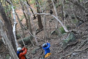 2022年度から始まった屋久島研修ツアー。今年は通常コースが7名で12/4(木)~7(日)、経験者向けのアドバンストコースが2名で12/7(日)~10(水)、スタッフは湯本、江戸、赤見の3名が同行しました。クスノキの葉をもりもり食べていた去年に比べ、今年は実りが良かったようで、マテバシイ、シマサルナシ、モクタチバナ、ホルトノキ、カラスザンショウなどさまざまな堅果・果実を食べていました。ほお袋をパンパンにして、モグモグしながら仲間とグルーミングし合う姿が印象的でした。写真は左が通常コース、右がアドバンストコースのものです。