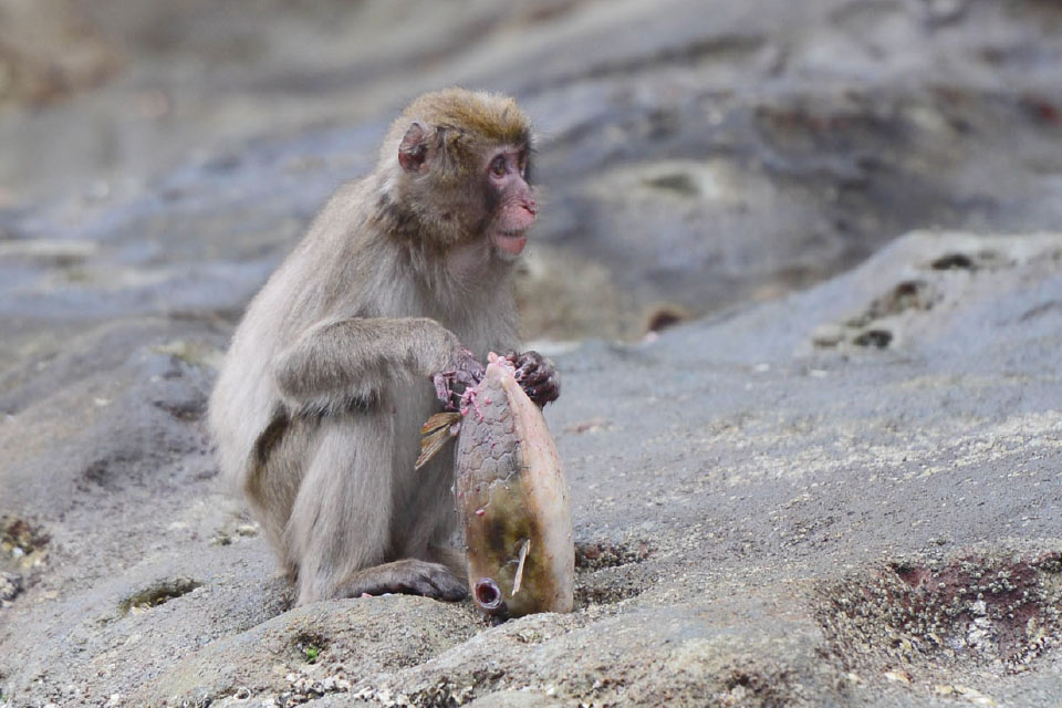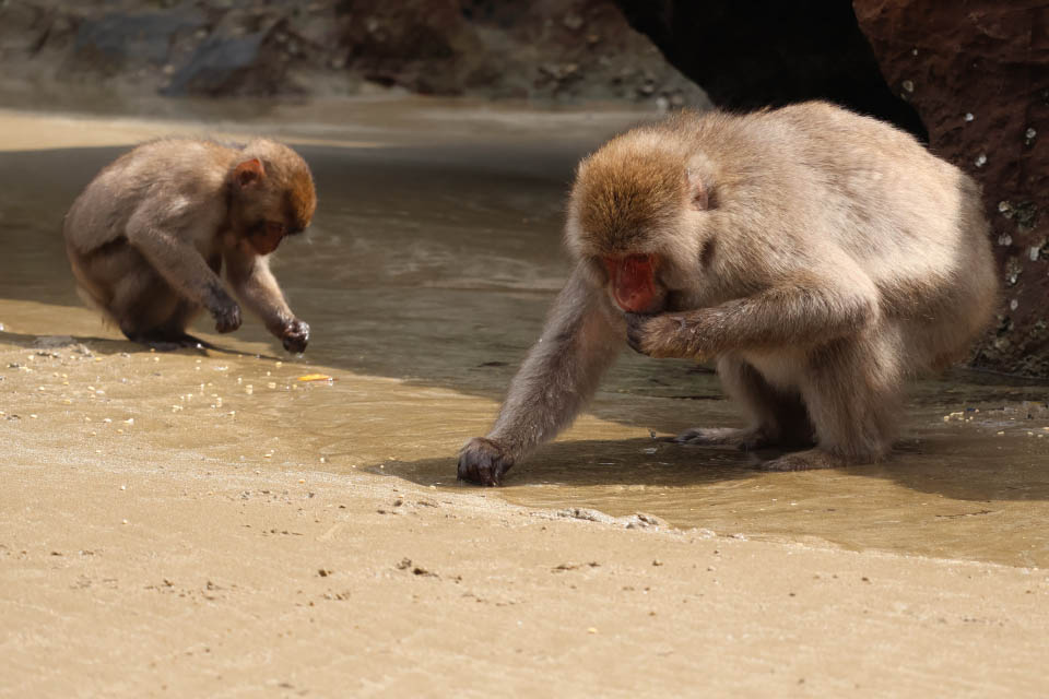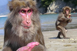 100頭を超える群れがほぼ毎日、エサを食べに海岸にやってきます。与えられたエサも食べますが、海岸で食べものを探すことも。食後にくつろいだり、コドモたちは遊んだりしながら夕方まで滞在し、山に帰っていきます。