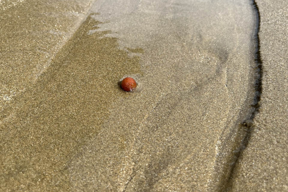 風のない波の静かな日には、波打ち際まで下り、海の恵みを堪能します。海岸線のハマナスの花や実、ハマエンドウの葉などの植物、海岸線に打ち上げられた海藻類、タマキビ、カサガイといった貝類。それに漂着した野菜や果物にも目がありません。
