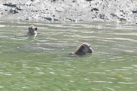 カニクイザルは泳ぎも得意で、“犬かき”のような泳ぎ方でスイスイ泳ぎます。浅い海なら潜って海底の食べ物を探すこともあります。
