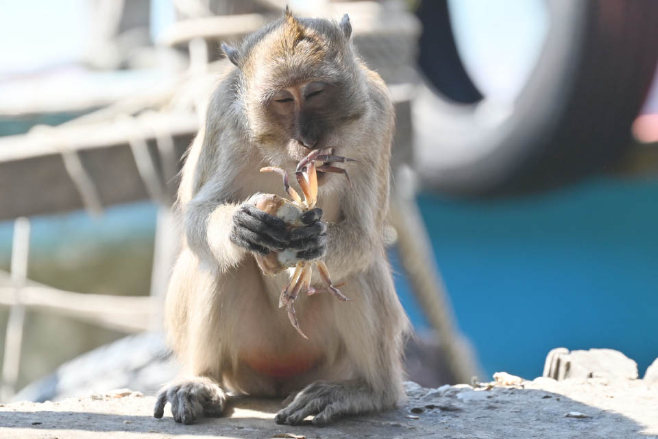 その名のとおりカニを食べるカニクイザル。ふだんの食べ物は植物が中心ですが、海辺でくらす群れは積極的に海産物も利用します。カニ、貝類、魚類、ナマコまで・・・