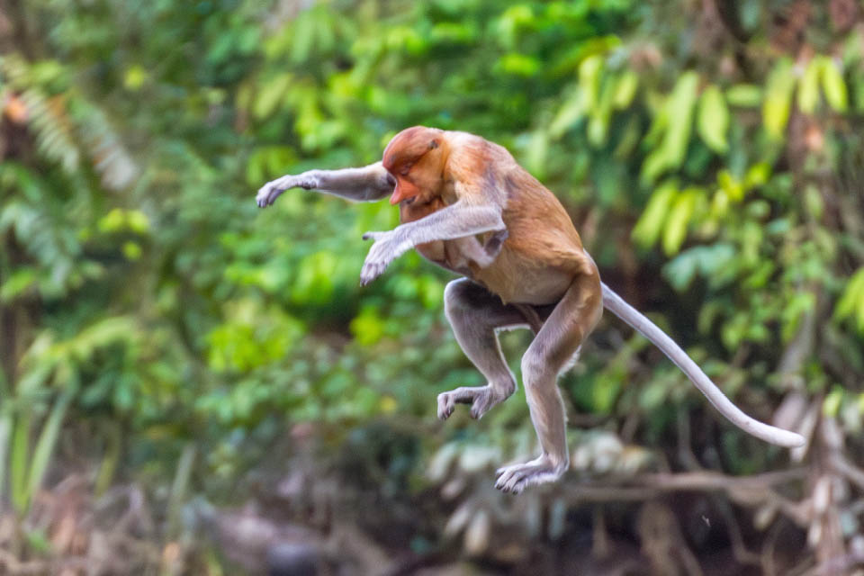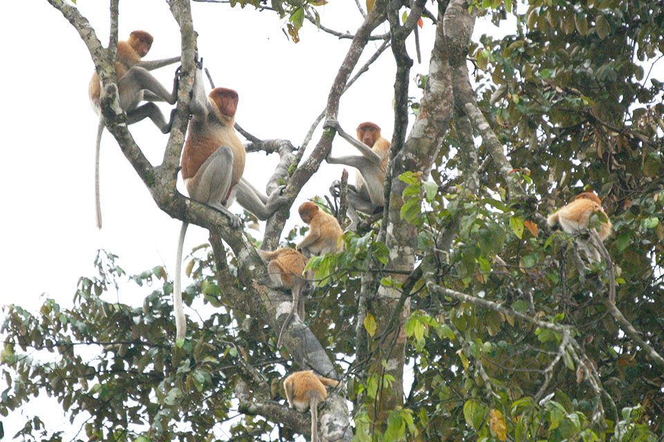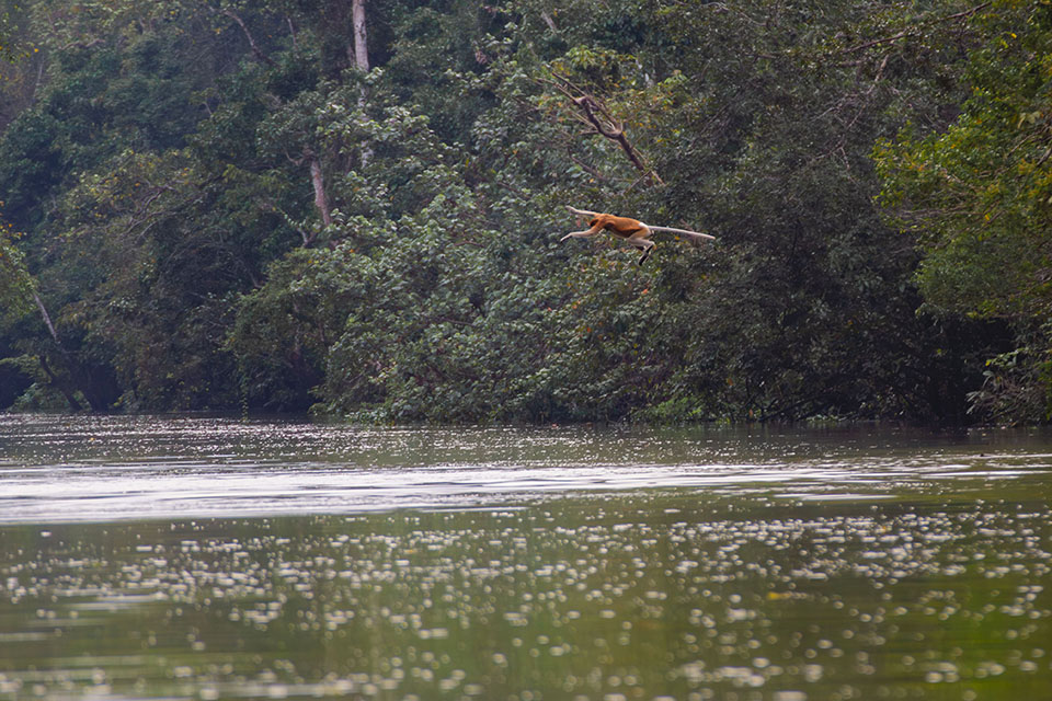 東南アジアのボルネオ島のみに生息するテングザルは、夜はきまって水辺の木の上に集まって眠ります。夜の森ではウンピョウなどの捕食者が活動していますが、危険が迫れば水に飛び込んですぐに逃げることができます。