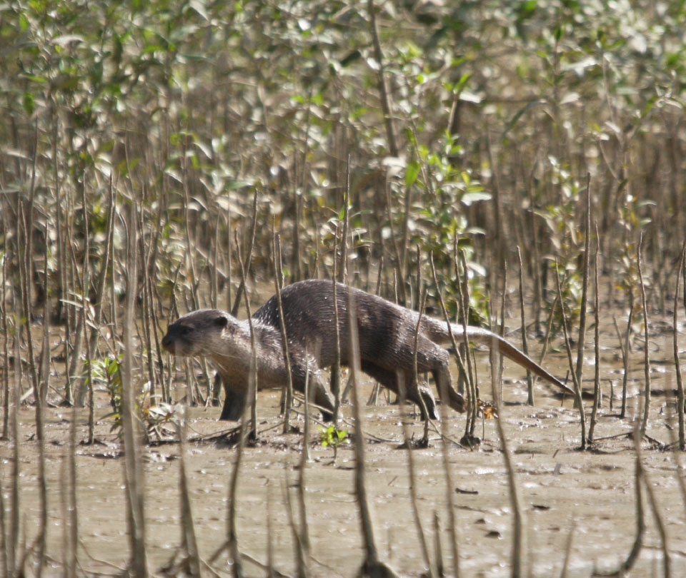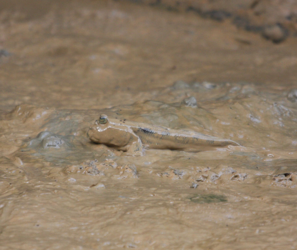 海水と淡水の入り混じるマングローブ林では、汽水でも生育できるヒルギなどの植物が育ち、タコ足のような支柱根や地上に突き出た呼吸根など、複雑な環境が多様な生物を育みます。