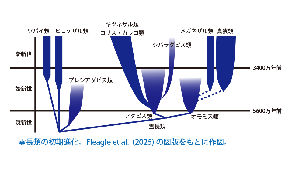 霊長目に分類される動物が地球上に登場したのは、化石記録からは暁新世後期とされています。諸説ありますが現在見つかっているもっとも古い霊長類の化石とされるアルティアトラシウスは北アフリカ・モロッコのおよそ5700万年前の地層から見つかっています。その後始新世(5600万年前~)に入ると、現生のグループにつながるアダピス類とオモミス類、それぞれの化石が北米とユーラシア、あるいはアフリカの北部で見つかっています。このことから北半球が霊長類の登場と初期進化の舞台だったと考えられます。