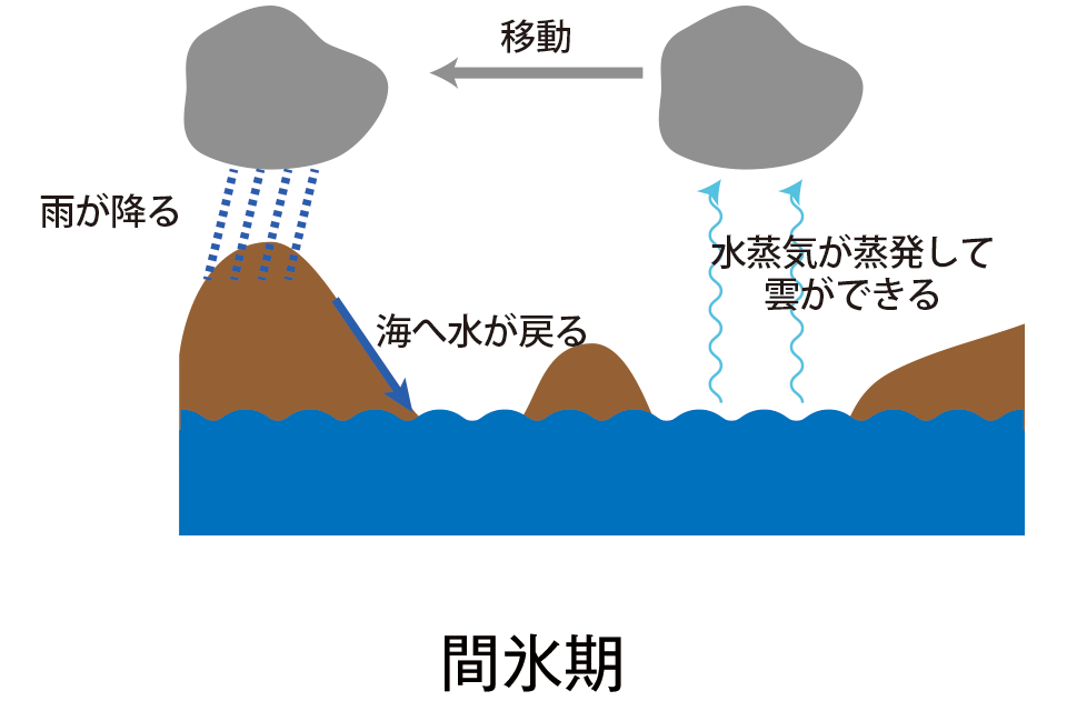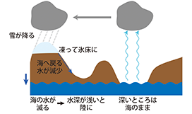 260万年前、第四紀に入ると地球は寒冷な氷期と温暖な間氷期を繰り返すようになりました(現在は間氷期)。氷期になると高緯度地域や高標高地域には氷床や氷河が発達します。これによって水が氷として陸地にとどまり、海の水は減っていきました。最後の氷期、およそ12000年前には現在よりも海水面が120~130mほども下がったといわれています。つまり、現在水深が120mよりも浅いところは一次的に海の上に出た陸地になっていた、ということです。