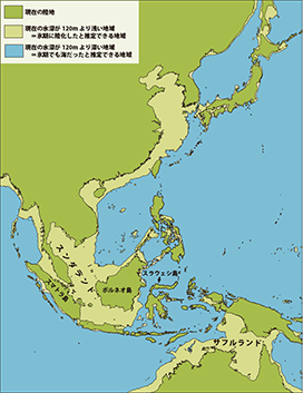 現在、東南アジアの多くの島々に霊長類が分布しています。そのほとんどはラフティングのように海を渡って入ったわけではありません。氷期には東南アジアに広大な「スンダランド」が形成されました。現在は島にくらす霊長類も多くがこの一時的な陸地を通って分布を広げたものと考えられます。