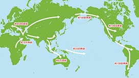 時代が下って約3000年前、弥生時代が始まる時期には、朝鮮半島から対馬海峡を渡って、稲作や青銅器、弥生式土器などの技術を携えた人々が大量に流入してきました。その後も、シルクロードの東端に位置する日本列島にはさまざまな人々が流入して混じりあい、現在の日本人が形成されてきました。