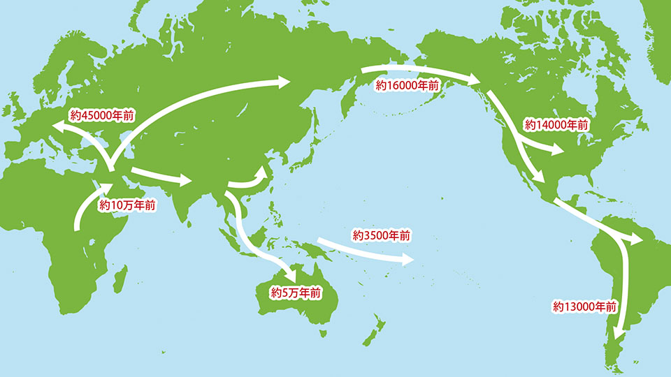 人類は約700万年前にアフリカで誕生しました。その後、長い間アフリカ大陸にとどまり続けますが、約200万年前に登場した原人のなかまが、初めてアフリカ大陸を出てユーラシア大陸へ歩いていきました。その後も旧人の出アフリカが起きましたが、ユーラシアにとどまっていました。
