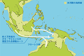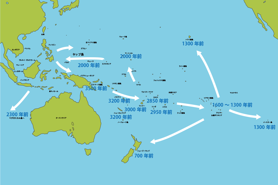 人類の海洋進出は、約5万年前にオセアニア地域で始まりました。やがて、日本列島や太平洋の島々へ、舟を使って拡散していきました。