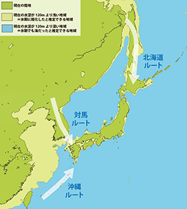 もっとも古い日本列島への移住は、約38000年前頃から始まります。朝鮮半島から対馬海峡を越える「対馬ルート」と、台湾から琉球列島を経由する「沖縄ルート」が想定されています。海を渡って日本列島に広がった人々が、最終氷期の終わり(約1万年前)とともに縄文文化を花開かせていきました。一方、津軽海峡で隔絶された北海道には、陸づたいにサハリンを経由する「北海道ルート」で主な移住が起こり、独自の文化が形成されていきました。