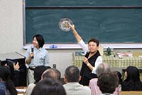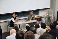 秘蔵映像上映会&トークでは、山極館長の“先輩”である元学芸員の水野礼子さんからの振りで、いろいろな裏話が・・・ |