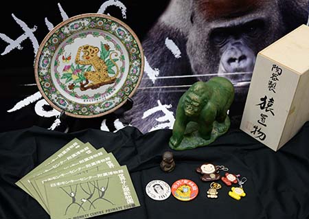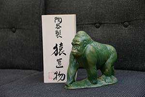 | モンキーセンター創設30周年の記念に作製された陶器製の「猿置物」。力強くナックルウォークするゴリラです。 |
