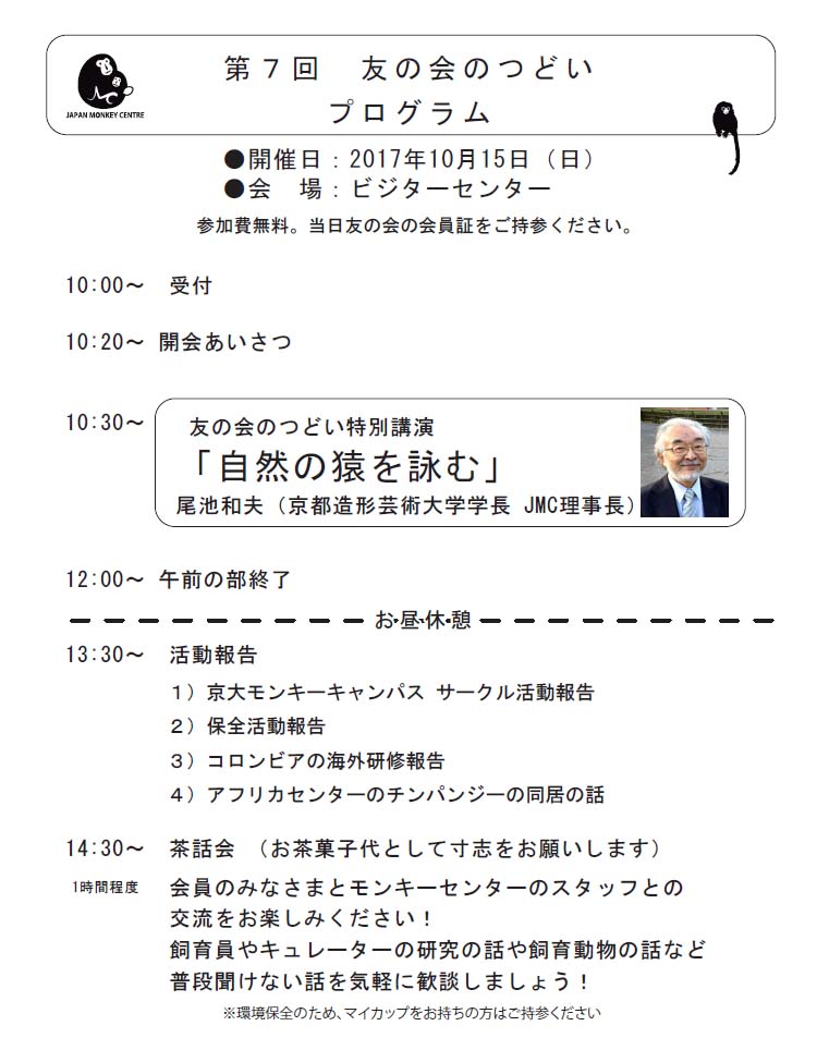 翌日10/17(月)は創立60周年記念日です!!これを記念して、山極博物館長による記念講演や、非会員の方にも公開しての「モンキーセンター・タイムトラベル」、活動報告をおこないました。