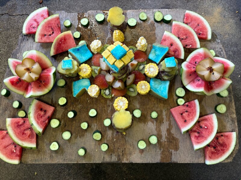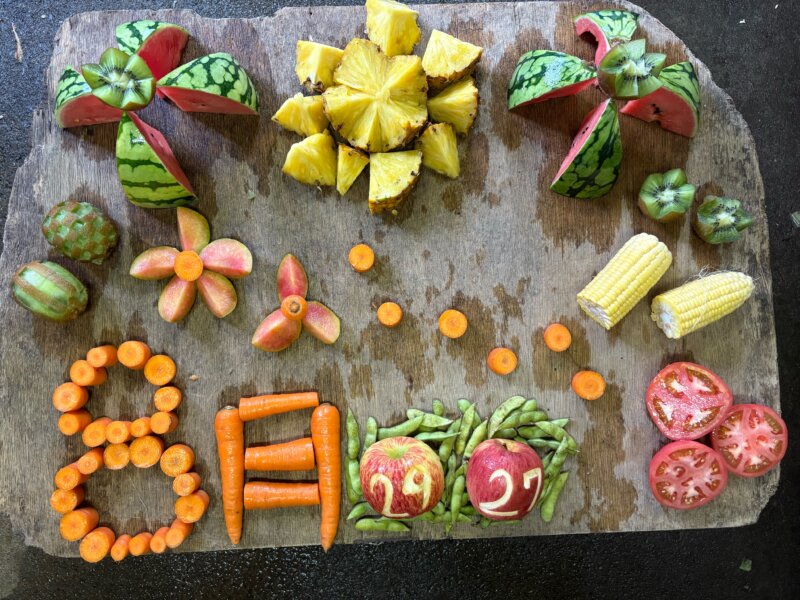 夏といえばスイカ!ですよね。テーマは「夏休み」です笑。リンゴやトマト、枝豆にニンジン、プラム、キウイ、トウモロコシ、パインを使ってます。夏のバカンス気分をイメージしています。