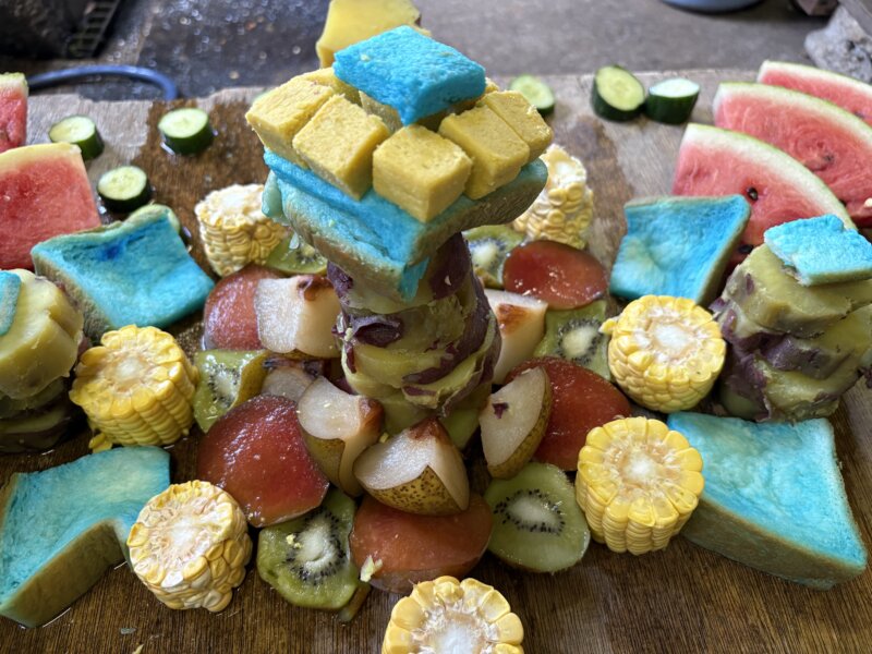 スイカ、トウモロコシ、キュウリ、キウイ、パン、プラム、梨などを使っています。