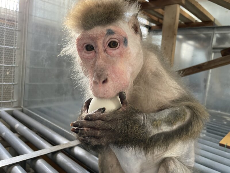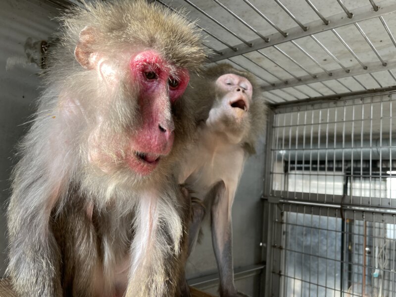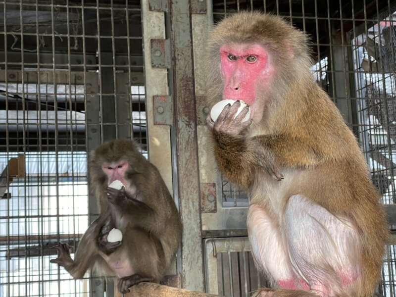 ヤクシマザルのヒゲッコ(左)とヒャポタ(右)。2個体とも頬袋にゆで卵が入っています。