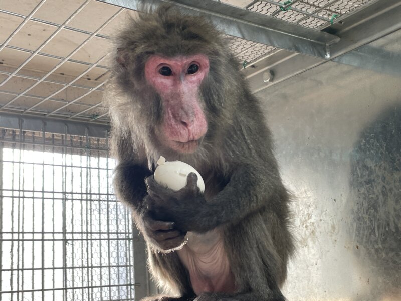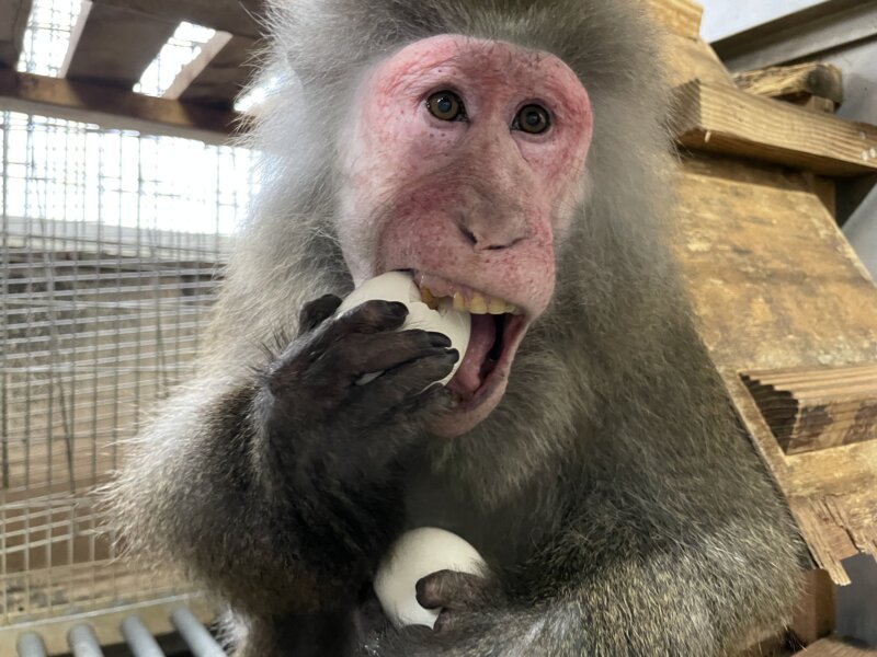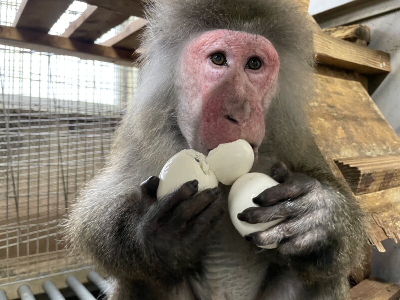 それにしても、みんなすごい勢いです!とてもいい刺激になったなと、見ている私も嬉しくなりました!強い個体が独占するかなとも思いましたが、弱い個体も負けずに参戦していました。強い個体たちも、弱い個体たちのことを気にしている余裕がないようにも見えます。お正月イベント「サルおせち」のときとは、全然違う雰囲気です!彼らにとっての卵の希少性が伺えます^^