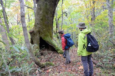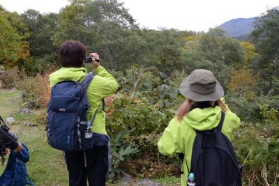 ガサガサと木が揺れました。え?風もふいてないのに?と思い、急いで双眼鏡を覗いたところサル発見!!オトナ♀2頭、コドモ4頭(内1頭は1歳、残りは不明)が木の上で毛づくりをしたり、コドモたちがわちゃわちゃと遊んでいたりしており、しばらくしたら木から全頭降りて、森の中に消えていきました。先輩方が休暇村妙高笹ヶ峰キャンプ場の方向に向かっていったようにみえたとのことなので、いったん朝食をとり、身支度をしたあと、それぞれ個別行動でキャンプ場近辺を散策しましたが、発見はならず。