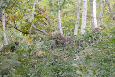 星野&奥川チーム→杉田&赤見チームと引継ぎ、謎の群れを追跡します。11:30、深い藪に入ってしまって謎の群れの追跡を断念。向かった方向をしっかり見届けたあと、お弁当を広げて食べ終わったころ・・・なんと別の方向にサルが!よくよく見ると、昨日識別できた個体がいます(同じ個体に再開できた時のよろこびはひとしおです!写真は上がハナキレ♂、下がシウム♀)。つまりこれは「笹ヶ峰群」です。ということはさっき藪に消えていったのが「ダム群」?