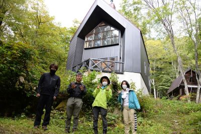 第1回目の調査はこの4人のパーティーでおこないました。最終日にヒュッテ前にて。笑顔ですが、サルを見つけることができなかったので“最高の笑顔”とはいきませんでした。今後の調査に期待!!(報告者:赤見)